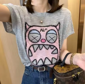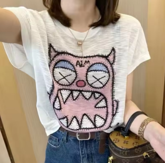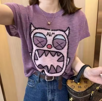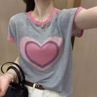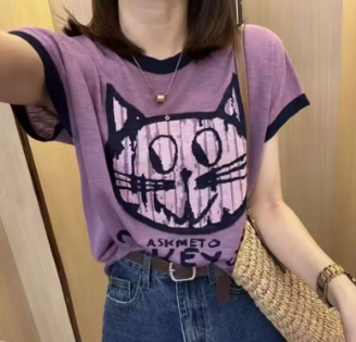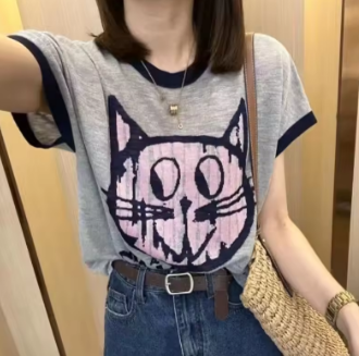 2023 Summer Tees Women's Pure Cotton Round Neck T-shirt Women's Spliced Printing Casual Fashion Short Sleeve Pullover Tops