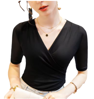 40-85kg Summer Thin Women Crossed V Neck Mesh T Shirts Lady Elegant Elastic Base Folds Tops Tees Female Half Sleeve T-Shirt