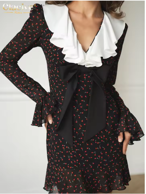 Clacive Fashion Loose Print Women's Dress 2025 Casual Ruffle Collar Long Sleeve Mini Dresses Elegant Bow Patchwork Female Dress