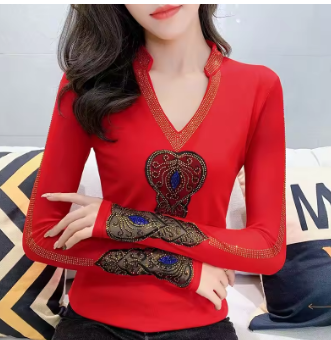 High Quality Autumn Fashion Women V-Neck Luxury Golden Hot Diamonds T-Shirt Sexy Long Sleeve Tops New Streetwear Girl Brand Tees