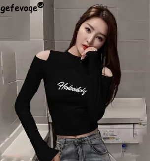 Korean Style Letter Printed Aesthetic Tee Shirt Sexy Off Shoulder Slim Short Tops Women Wild Long Sleeve Y2k Streetwear Crop Top