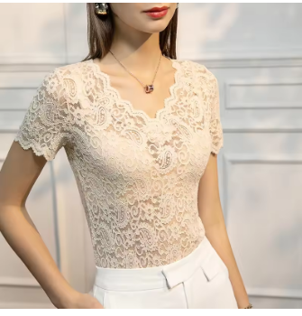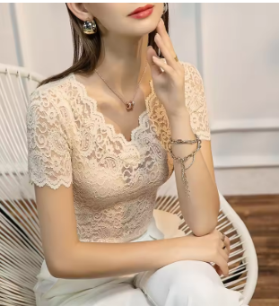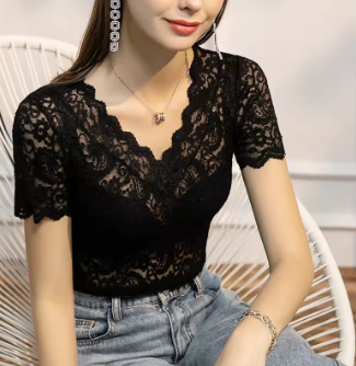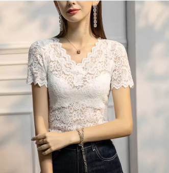 MadBlack Summer T-Shirt European Clothes Women Sexy V Necks Lace Tops Short Sleeves Bottoming Tees Spring New 2023