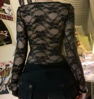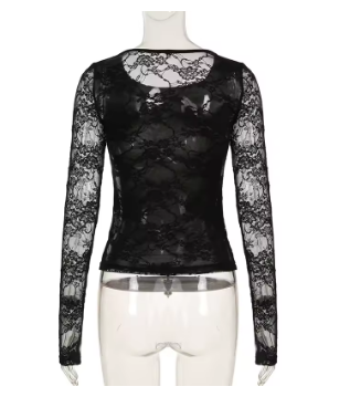 SUCHCUTE Black Gothic T-shirt For Women Sexy Club Lace Semi-see-through Long Sleeve Crop Tops Y2K Aesthetic 2000s Tee Autumn New