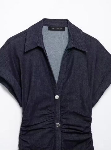 Women Denim V-neck Short Sleeved Long Dress Chic Slim Fit Single Breast Slit Vestidos New High Street Casual Solid Commuter Gown