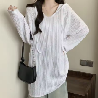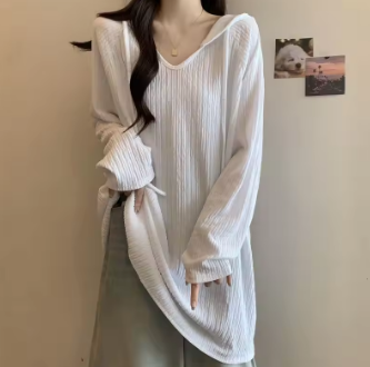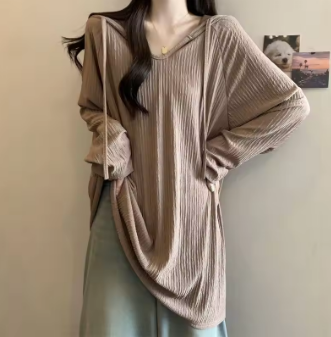 Women Trendy Simple Casual Oversize Hooded T-shirt Korean Solid V Neck Long Sleeve Tees Textured Chic Tunic Tops Female Clothing