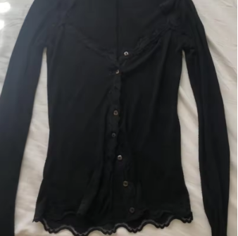 y2k Vintage Lace Trim Black T-shirt Button Low Cut Long Sleeve Slim Fit Crop Top Elegant Lady Fairycore Grunge Retro Tees Women